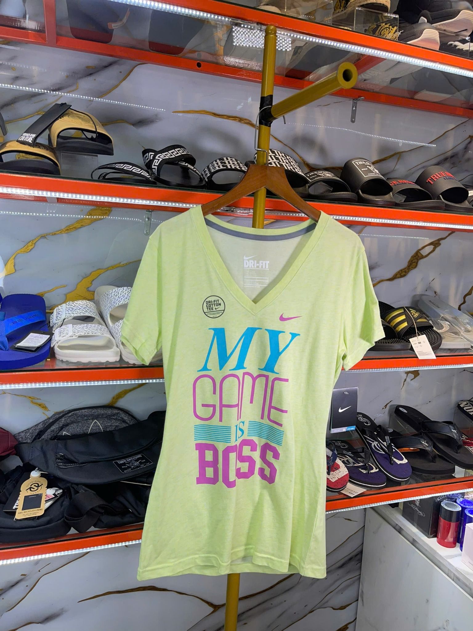 Mua Áo Thun Nữ Cổ Tim Nike Xanh Chuối Chữ Hồng Xanh - New - 627161 chính hãng HCM
