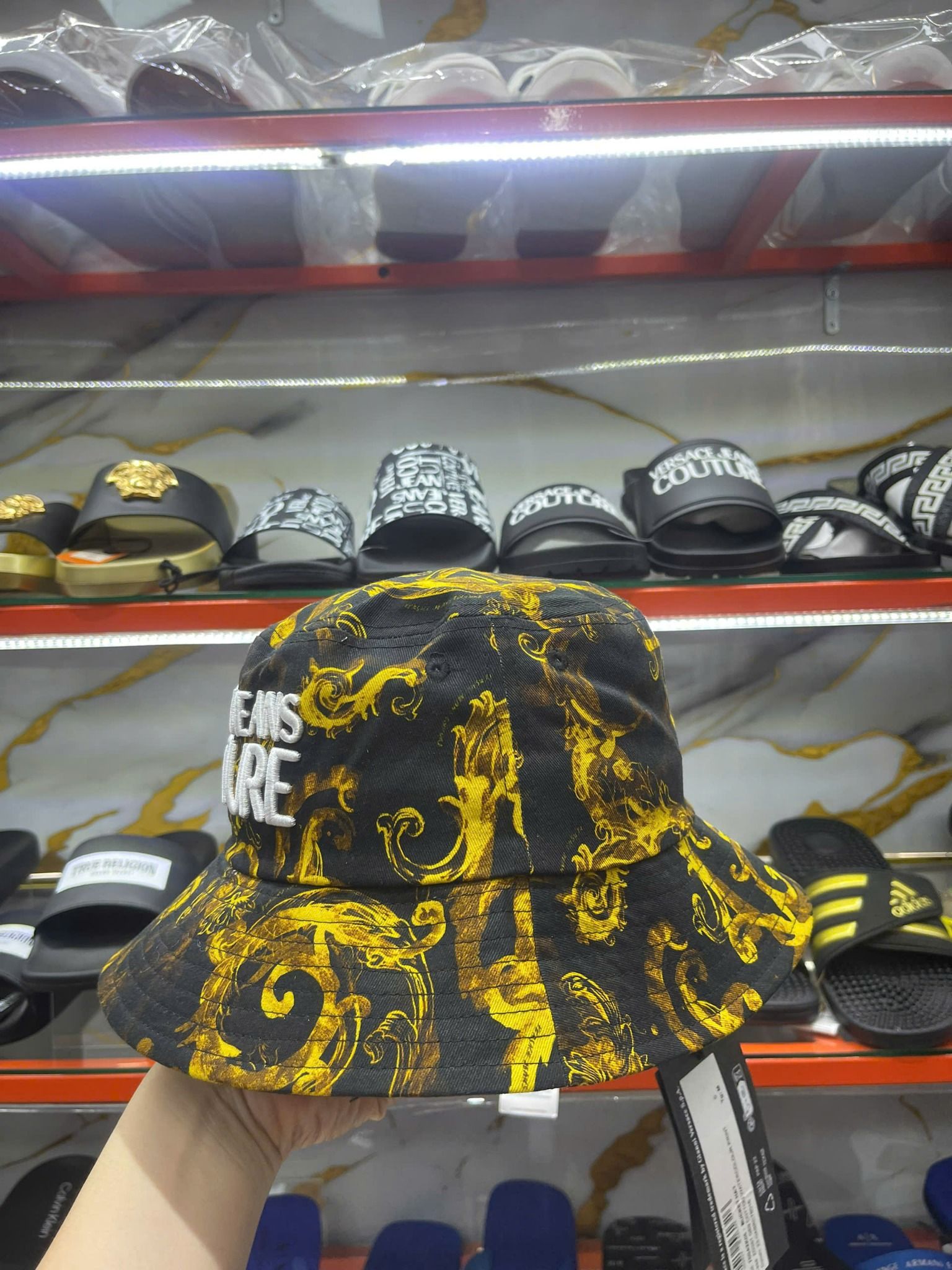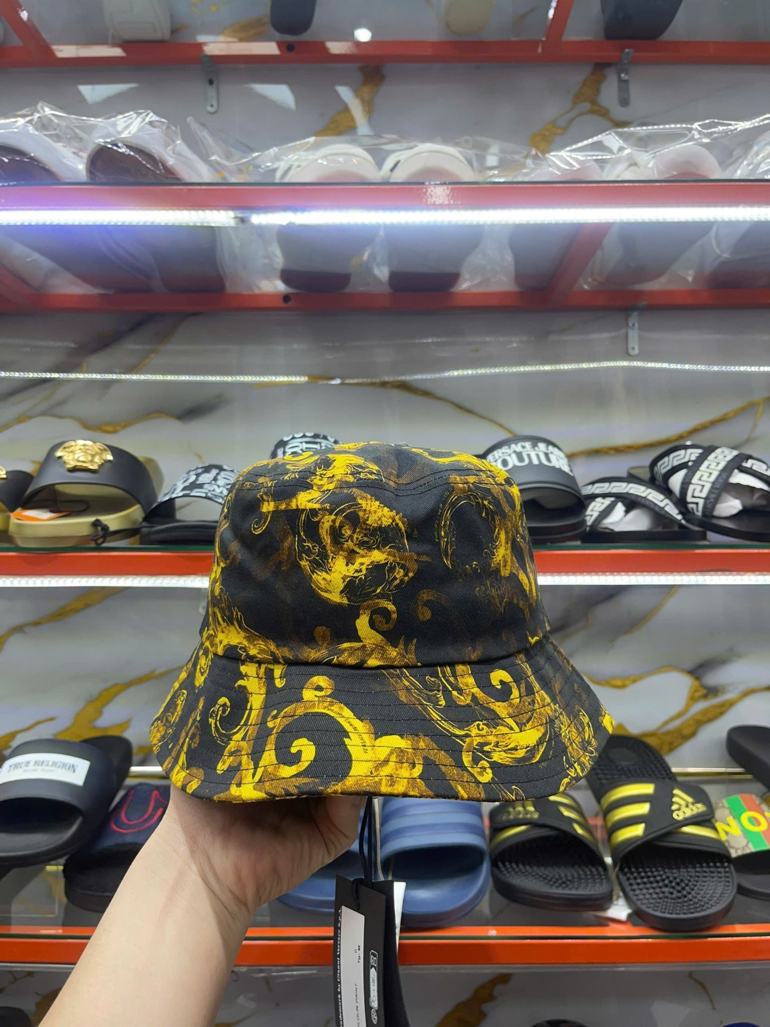 Thiên Đường Hàng Hiệu cung cấp sản phẩm Nón Tai Bèo Versace Đen Hoa Vàng Chữ Trắng - New - 76GAZK06 chính hãng nhập mới từ Mỹ